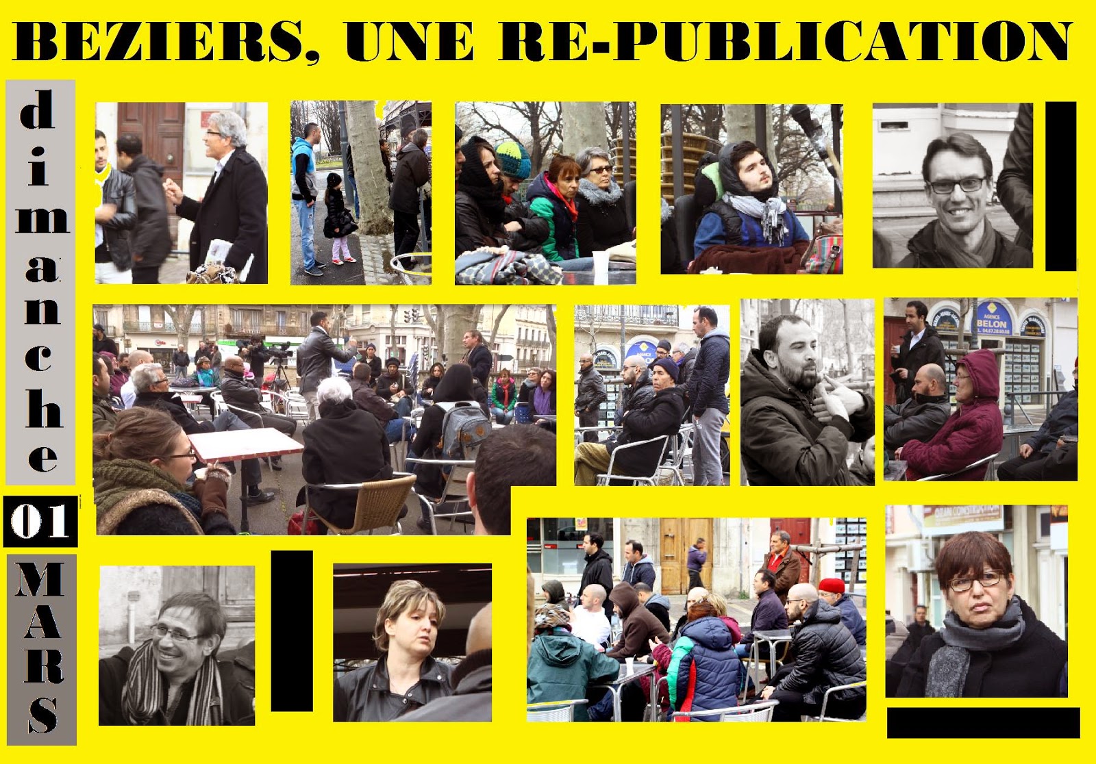 Nous avons organisé ce dimanche matin "Béziers, une républication" ! Un an, qu'on entend parler de Béziers qu'aux travers des coups d'éclats de sa municipalité, nous avions envie avec Lazreg, que les assos, les belles initiatives, ceux qui dans leur opiniâtreté continuent de rayonner utile, ceux qui font autant, si ce n'est plus, "exercice" de citoyenneté, de solidarité, nous voulions que ceux là soient mis à l'honneur !!! - je dois ajouter, et il faut le comprendre, que nous y sommes allés avec un minimum de respect que l'on doit à une ville, à une municipalité, qui a été élu démocratiquement ! Voila pourquoi dans l'esprit, nous cherchions plus à comprendre, qu'à faire le procès de qui que ce soit.